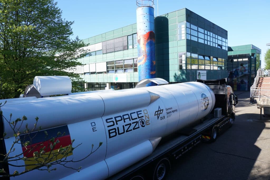 Einmal ganz hoch hinaus; davon träumen wohl viele von uns. In den Weltraum zu fliegen, ist den meisten dann aber doch nicht möglich. Am 23.04.26 und 24.04.26 war der Spacebuzz One des Deutschen Zentrums für Luft- und Raumfahrt zu Gast an der Gesamtschule. Der 17 Meter lange LKW mit der großen weißen Rakete auf dem Auflieger ist wahrscheinlich jedem aufgefallen, der am Donnerstag oder Freitag über den Schulhof gegangen ist.